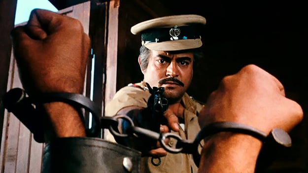 Soon after Jai and Veeru’s arrival in Ramgarh, they repel an initial advance by Gabbar’s gang of outlaws, but are nearly outgunned in a more organized attack led by Gabbar himself. Thakur is strangely inert during the shootout, standing motionless despite Veeru’s frantic calls for assistance. “Do you want to know why I didn’t pick up the gun?” Thakur asks Veeru later. Instead of offering an answer, Salim-Javed send us into a long flashback. We see a younger Thakur, in his police-force days, arrest Gabbar. The dacoit swears revenge, soon breaks out of jail, and captures Thakur. Then comes the film’s most electrifying image: Thakur tied to stone columns, arms outstretched on either side. Gabbar looms over him, a sword in each hand, repeating menacingly, “Yeh haath humko de de, Thakur” (Give me these arms, Thakur). As the swords swish down, there’s a cut to the present day, and a quick pan up and zoom out as a gust of wind blows off Thakur’s ever-present shawl, revealing that he has no arms. It’s a stunning bit of writing and direction, skirting a moment of violence that would never have made it past the censor board, but retaining its emotional devastation.