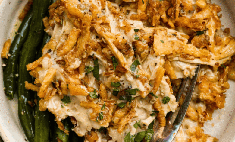 • Make Ahead: Assemble up to 24 hours in advance or freeze for up to 3 months. Cover tightly with plastic wrap (and foil if freezing). Thaw overnight before baking uncovered at 350°F for 35–40 minutes, adding crispy onions in the last 5–10 minutes.