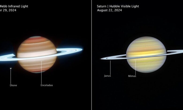 New images captured by the Hubble and James Webb space telescopes show Saturn in both visible and infrared light