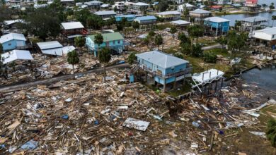 An aerial view of damaged houses are seen after Hurricane Helene made landfall in Horseshoe Beach, Florida, on September 28.…