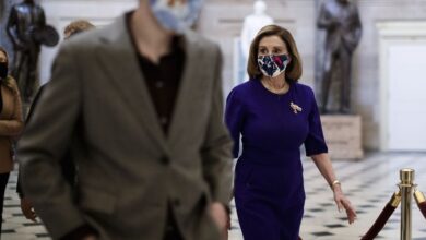U.S. House Speaker Nancy Pelosi, a Democrat from California, wears a protective mask while walking though the U.S. Capitol in…