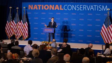Senator Josh Hawley gives a fiery speech on Christian nationalism at the National Conservatism Conference in Washington. Photo: Zach D…