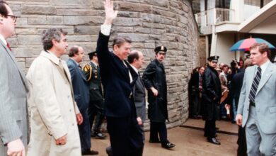 Ronald Reagan outside the Washington Hilton Hotel. Secret Service agent Tim McCarthy is on the far right. Photo: Corbis via…