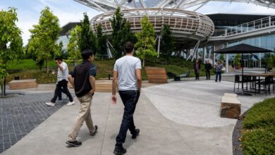 Employees at the Voyager Park and Walkway at Nvidia Headquarters in Santa Clara, California, US, on Monday, June 5, 2023.…
